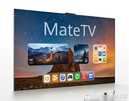 华为的智慧屏Mate TV屏幕尺寸从65到110英寸不等,内置鸿鹄Vivid处理器和独立画质芯片,提升了色彩与细节表现。配件包括悬浮触控板,具备隔空操作能力。系统为HarmonyOS 5,支持多种智能功能。
