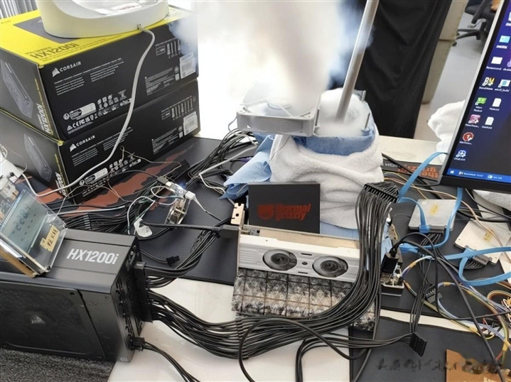 此次超频实验采用了液氦冷却技术,将处理器温度降至极低水平。超频过程中,处理器电压设置为1.388V。使用的硬件平台包括华硕ROG Maximus Z790 Apex主板、Corsair Vengeance DDR5内存(超频至DDR5-5744)、GeForce RTX 3050显卡以及Corsair HX1200i电源,这些专业设备为整个系统在极端条件下的稳定运行提供了保障。