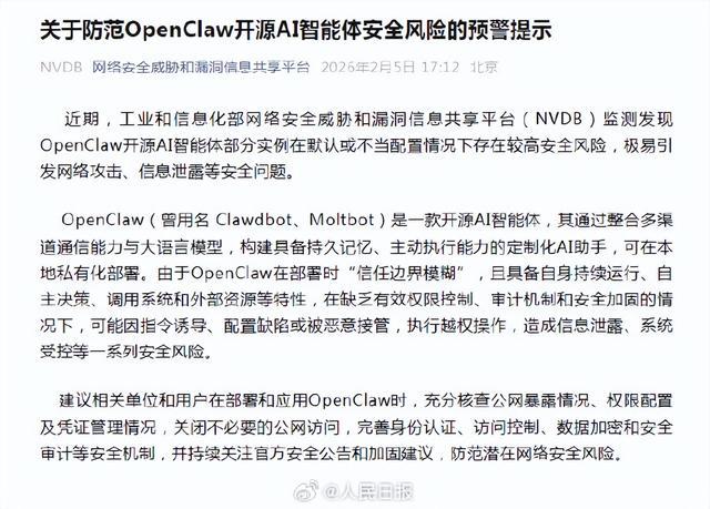 近期,工业和信息化部网络安全威胁和漏洞信息共享平台监测发现OpenClaw(俗称“龙虾”)开源AI智能体部分实例在默认或不当配置情况下存在较高安全风险,极易引发网络攻击、信息泄露等安全问题。