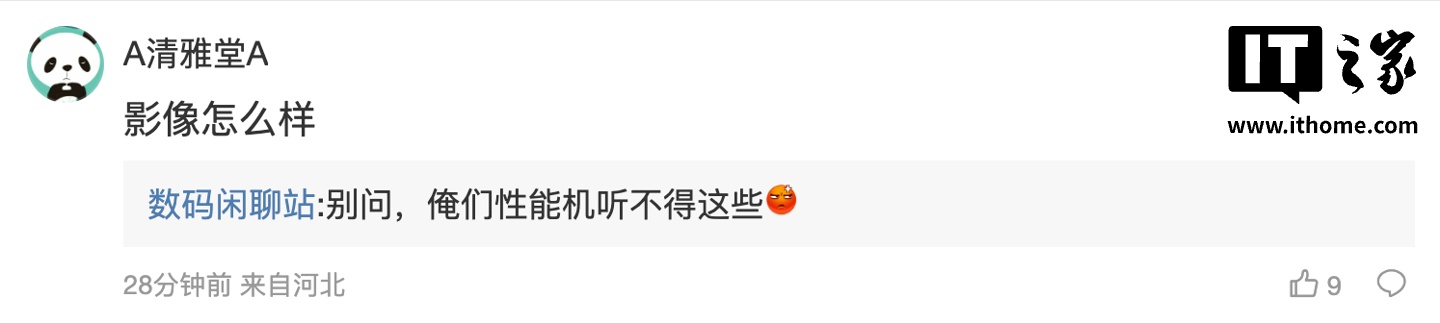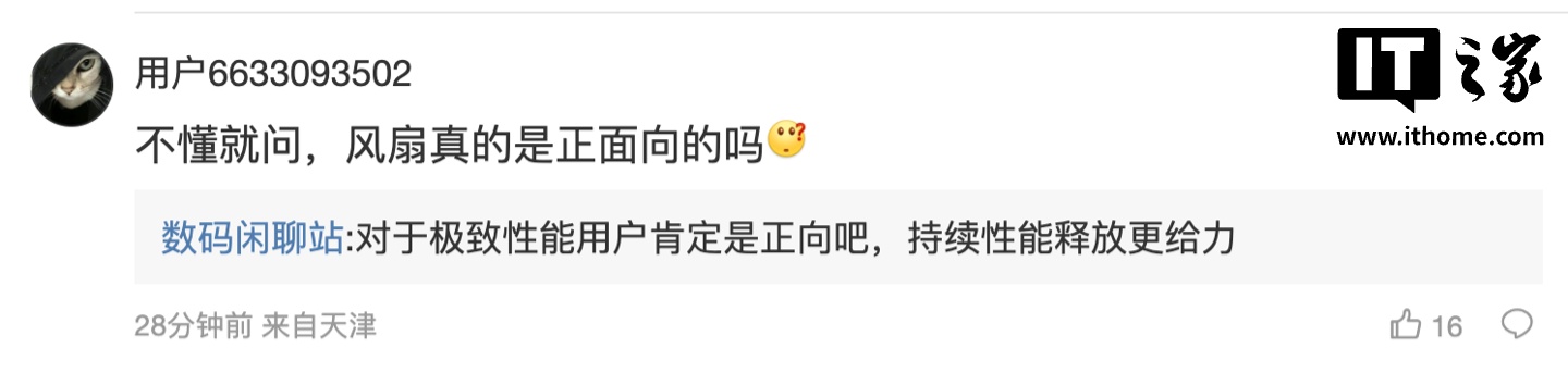 后续有用户在评论区询问:“影像怎么样”,博主回复道:“别问,俺们性能机听不得这些”;另一名用户则询问道:“不懂就问,风扇真的是正面向的”,博主则回复道:“对于极致性能用户肯定是正向吧,持续性能释放更给力”。